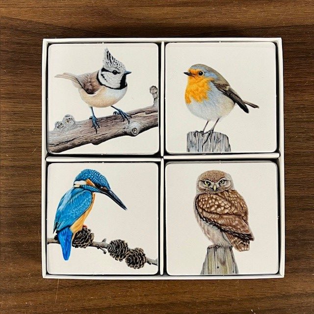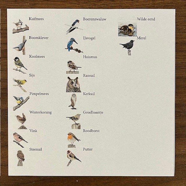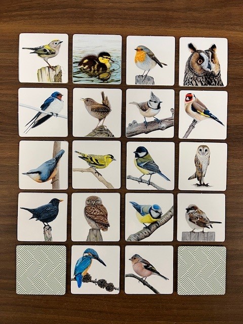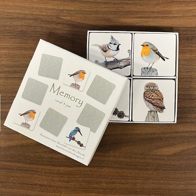 Memoryspel met 36 stevige kartonnen kaartjes met 18 verschillende vogelafbeeldingen. De kaartjes zitten in een kartonnen omdoosje met daarin ook een inlay waarop de verschillende afbeeldingen staan met daarbij de vogelnamen.